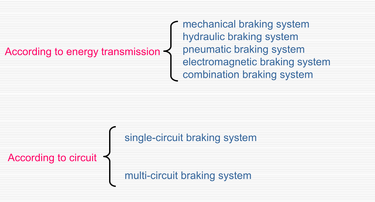 Braking systems are differentiated according to transmission device: single-circuit braking system and multicircuit braking system, as well as