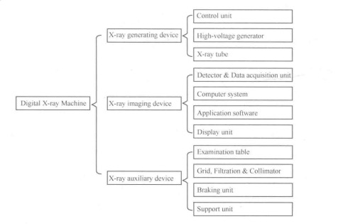 Although there are great differences among diagnostic X-ray machines fbr different diagnostic objectives, the fundamental structure of X-ray machines is similar, which consists of X-ray generating device, X-ray imaging device and X-ray auxiliary device, as is shown in Fig. 2-1-1.