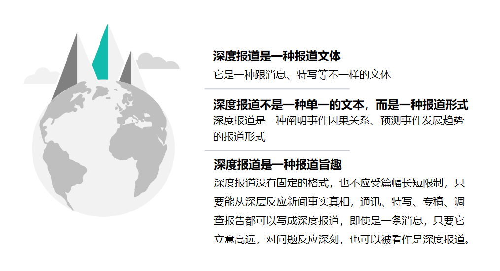 陈作平:“深度报道没有固定的格式,也不应该过多地受篇幅长短的限制,只要能从深层反应新闻事实真相,通讯、特写、评论、专稿、调查报告等都可以写成深度报道,即便是一条消息,只要它立意高远,对问题反映深刻,也可以被看作是深度报道。”