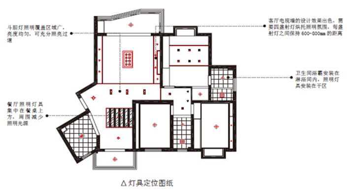 根据灯具定位图纸划分出客厅、餐厅、卧室、书房、卫生间以及厨房等空间的照明覆盖区域,并计算出相应空间内的灯具数量。