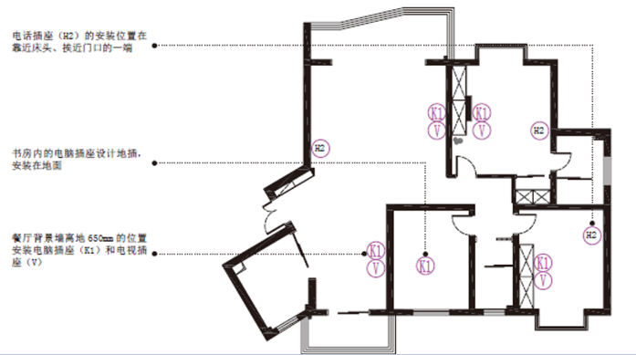 3强、弱电穿管走线的时候不能交叉,要分开;强、弱电插座应保持50c以上的距离。线路穿PVC管暗敷设,布线走向为横平竖直,严格按图布线,管内不得有接头和扭结。另外,穿管走线时电视线和电话线应与电线分开,以免发生漏电伤人、毁物甚至着火的事故。