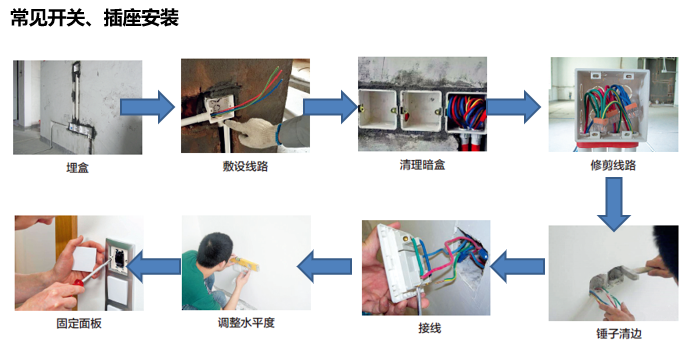 1施工前应确定开关、插座品牌,是否需要门铃及门灯电源,校对图纸与现场是否相符。