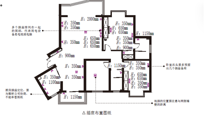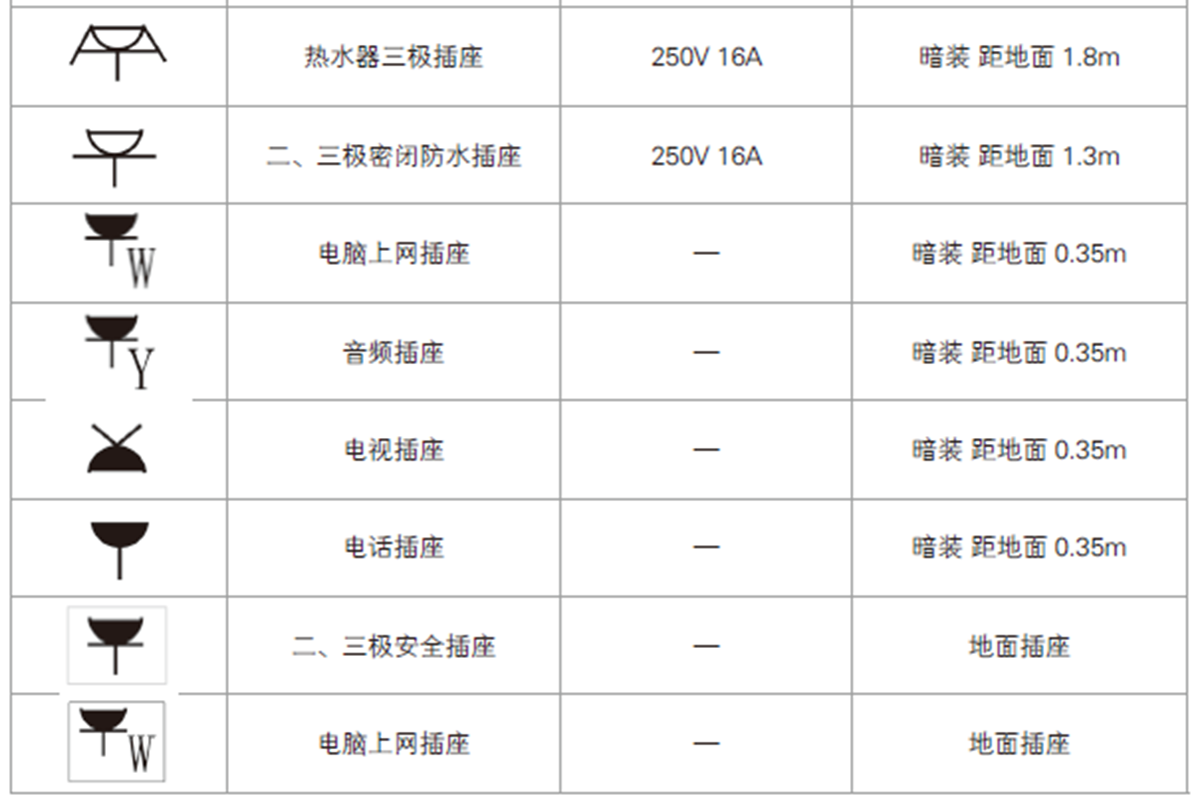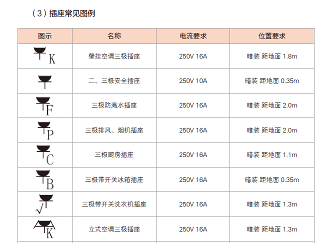 8电源插座底边距地宜为300mm,平开关板底边距地宜为1300mm。挂壁空调插座的高度距地宜为1900mm;脱排插座距地宜为2100mm;厨房插座距地宜为950mm;挂式消毒柜插座距地宜为1900mm;洗衣机插座距地宜为1000mm;电视机插座距地宜为650mm.