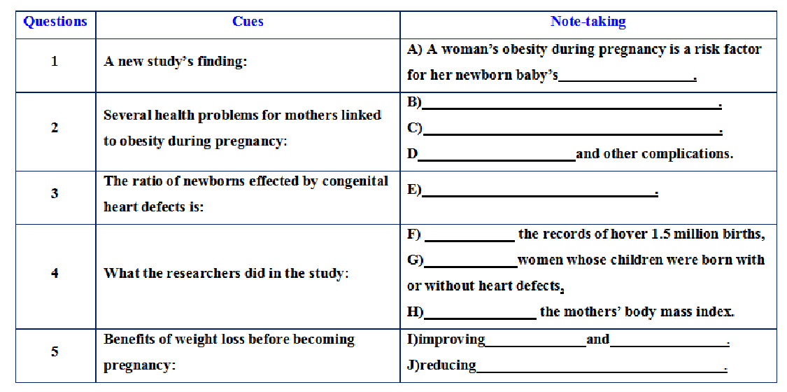 Get familiar with the words and expressions in the list, and the listen to the passage ."Mon's obesity raises newborn's heart risk" for twice. While listening, you are to take notes according to the given cues.