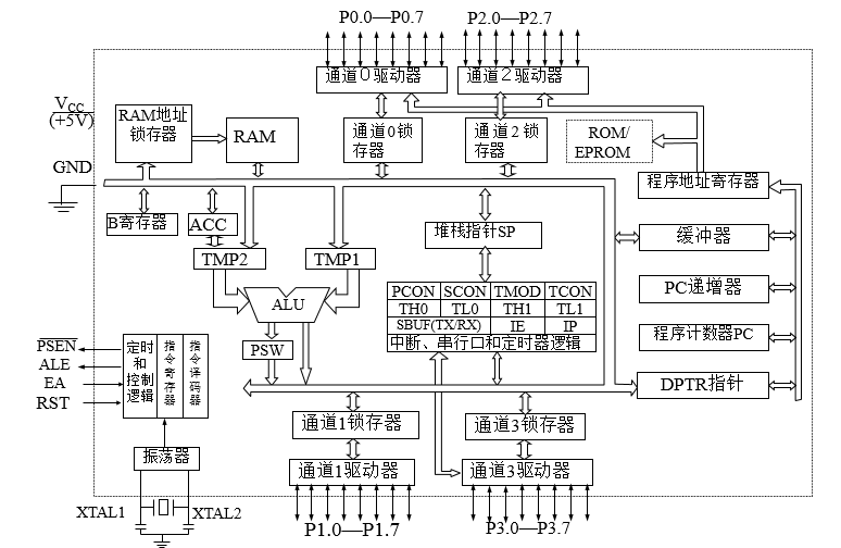 MCS-51单片机片内集成有振荡电路,控制逻辑电路在时钟统一控制下协调内外部件的工作。