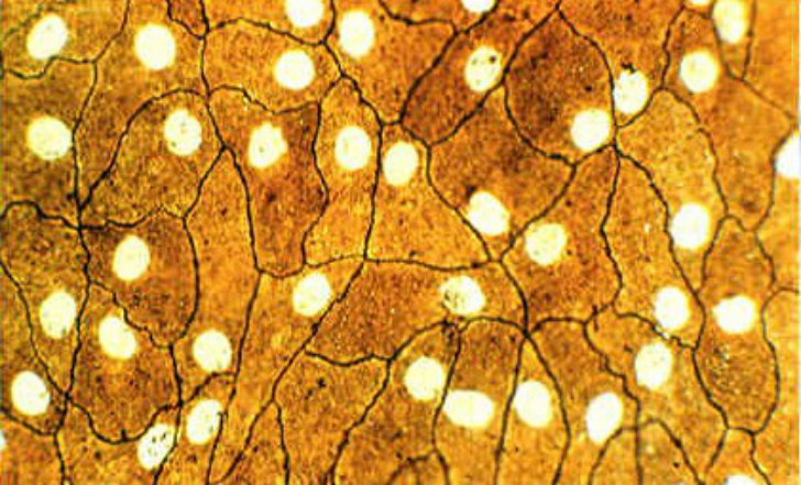 细胞呈多边形,胞核扁圆形,位于细胞中央。