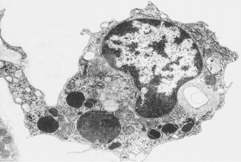 ● 光镜结构:形状不规则,可有伪足;胞质嗜酸性,可含吞噬物;核小,深染。