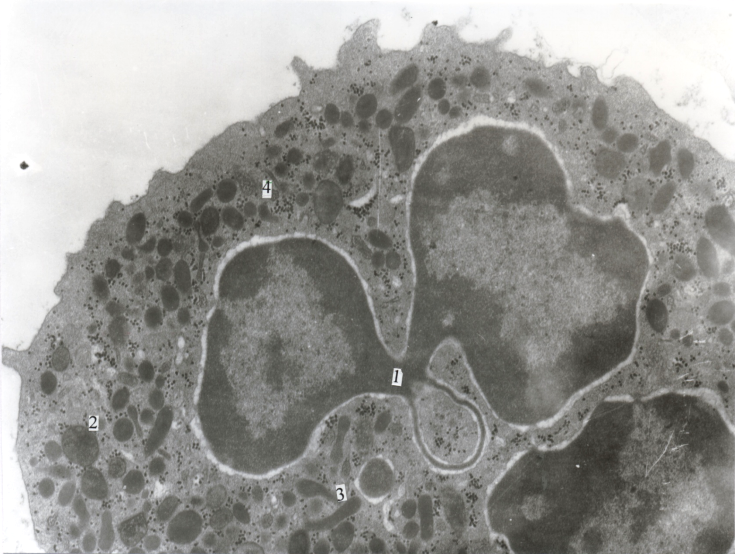 ● 核深染,呈弯曲杆状或分叶状,一般为2-5叶。