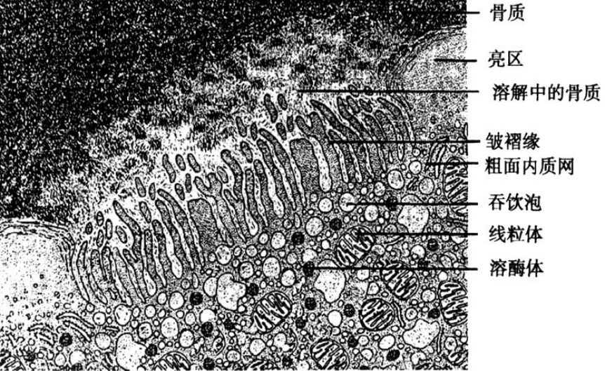 超微结构:溶酶体和线粒体发达;皱褶缘侧多突起,皱褶缘深面有许多吞噬泡。