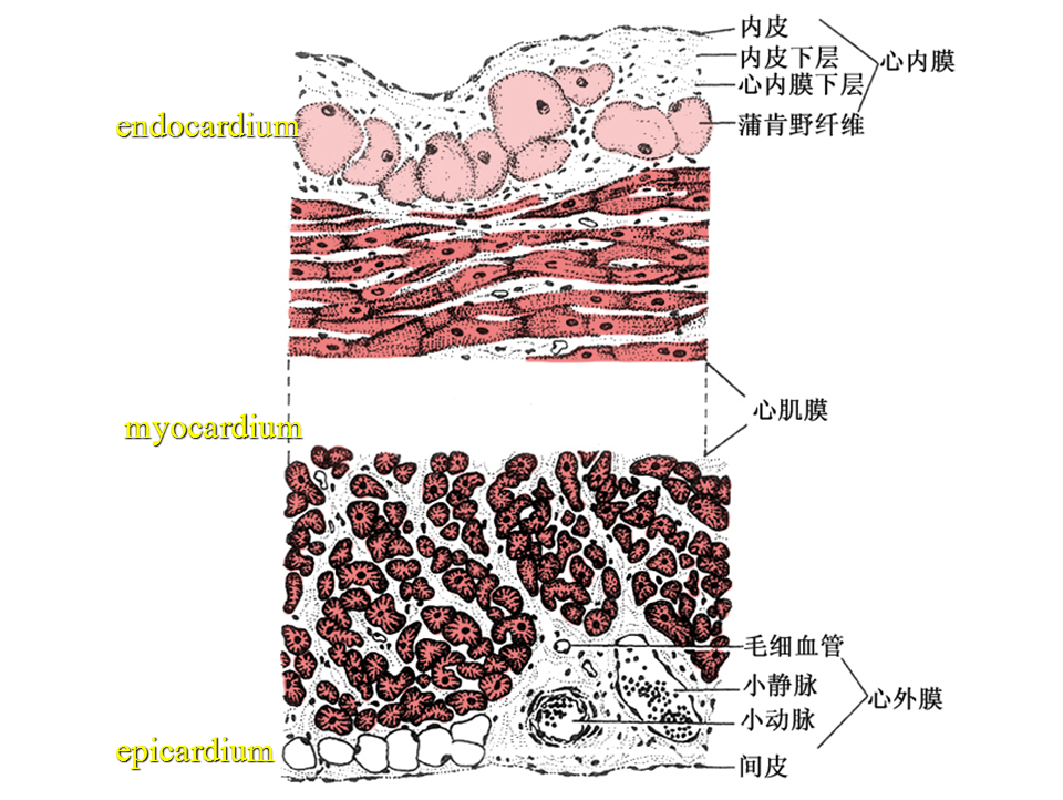 3.普肯耶纤维(Purkinje fiber) 组成房室束及其分支;与心室肌纤维相连,将冲动快速传递到心室各处,引发心室肌同步收缩。