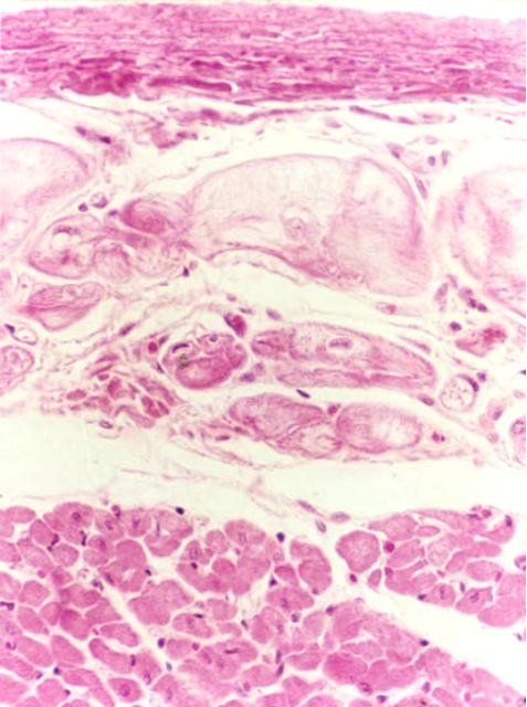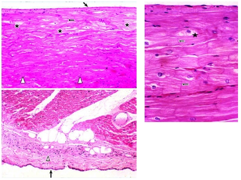 ● 心房肌纤维短而细,部分细胞含心房特殊颗粒(specific atrial granule),分泌心房钠尿肽(排钠、利尿、扩张血管和降低血压)。