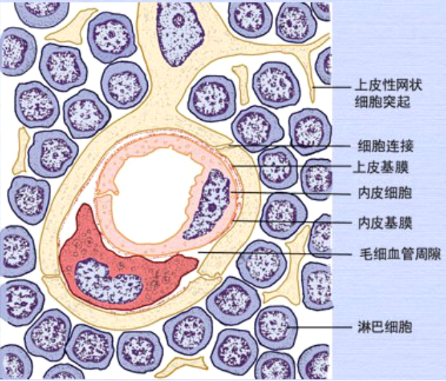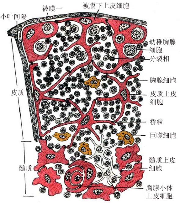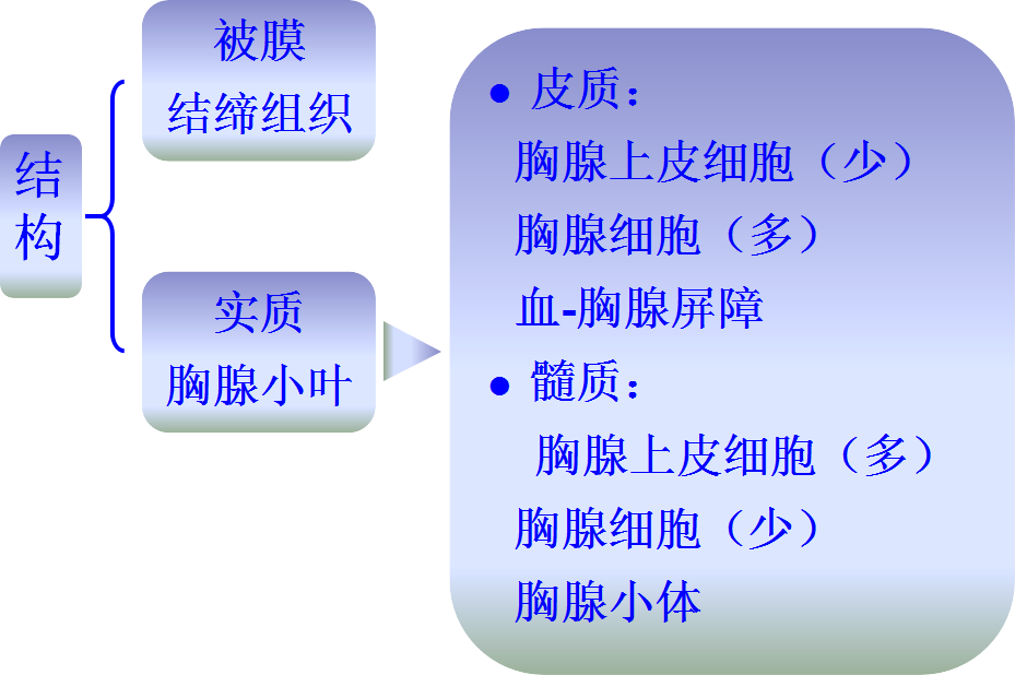2.组成:①连续毛细血管内皮及内皮间的紧密连接;②内皮的基膜;③血管周隙,内含巨噬细胞;④上皮基膜;⑤一层连续的胸腺上皮细胞。