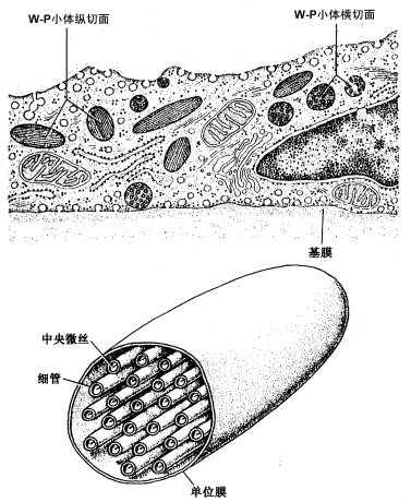 ● 内皮细胞含特征性、长杆状的W-P小体。内含冯威勒布兰特因子(von Willebrand factor,vWF),可同时和胶原纤维及血小板结合,参与止血。