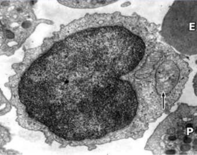 ● 核呈圆形,一侧常有浅凹,染色质浓密呈块状,着色深。