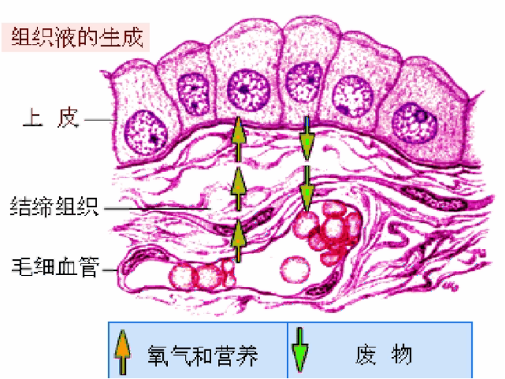 2.功能:构成细胞赖以生存的微环境;产生或回流障碍,导致组织脱水或水肿。