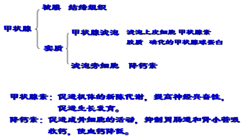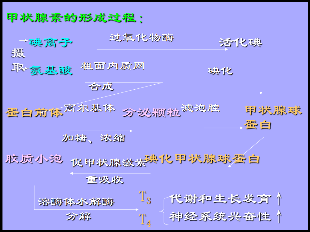 甲状腺素:促进机体的新陈代谢,提高神经兴奋性,促进生长发育。