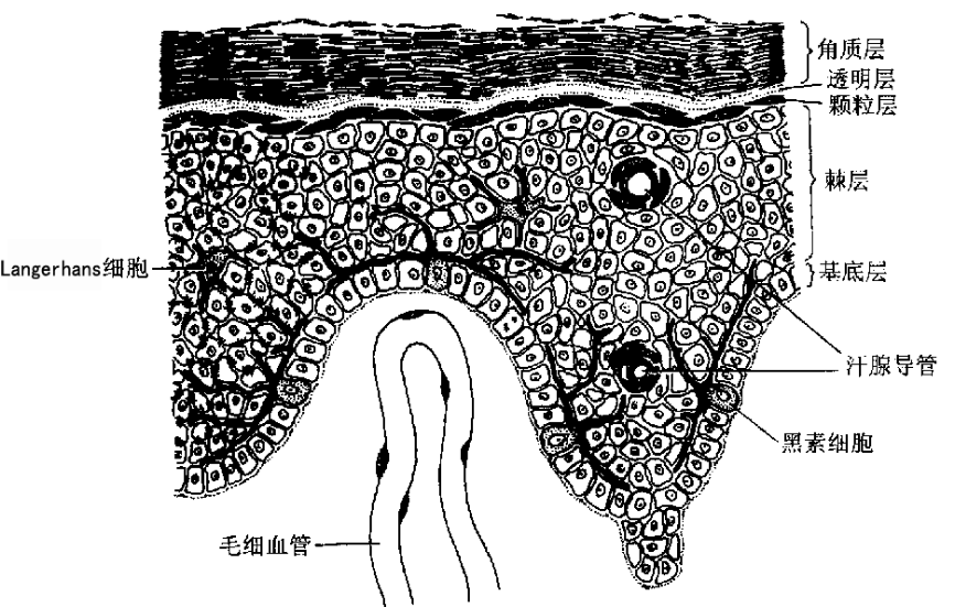 ● 表皮(epidermis)是皮肤的浅层,由角化的复层扁平上皮构成。表皮细胞分为两大类,一类是角质形成细胞(keratinocyte),占表皮细胞的绝大多数;另一类是非角质形成细胞,散在于角质形成细胞间,包括黑素细胞、郎格汉斯细胞和梅克尔细胞。