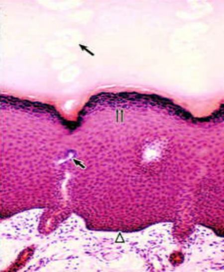 ● 浅表层细胞连接松散,脱落形成皮屑。