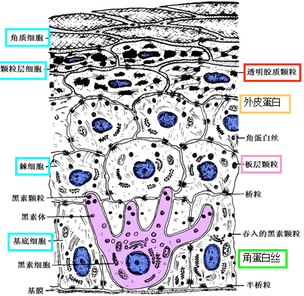 ● 胞质弱嗜碱性,合成角蛋白(形成大量角蛋白丝束)与外皮蛋白(增厚胞膜)。