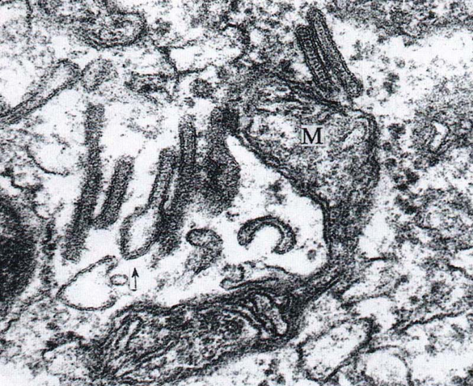 郎格汉斯细胞光镜图 (ATP酶组化染色) 郎格汉斯细胞胞质电镜图 (↑伯贝克颗粒)