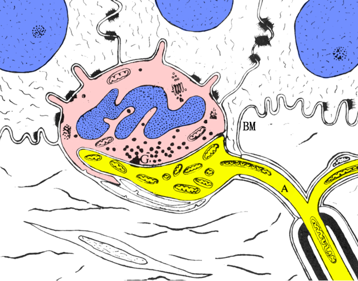梅克尔细胞与神经末梢超微结构模式图(BM 基膜,A 轴突):