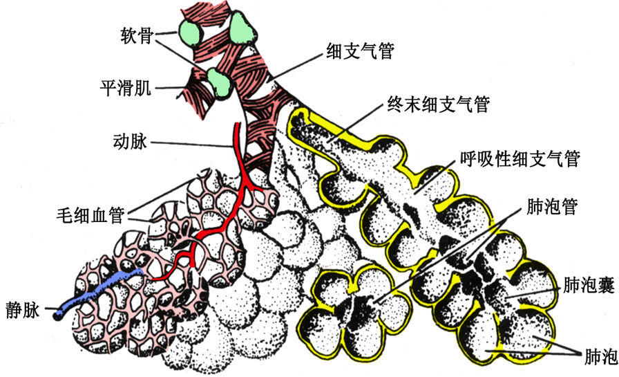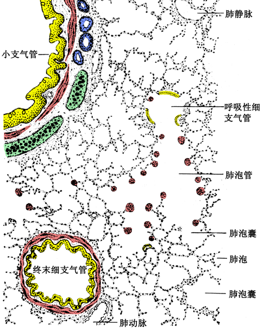 肺小叶:每个细支气管连同它的分支和肺 泡,组成一个肺小叶。