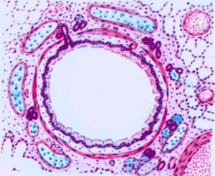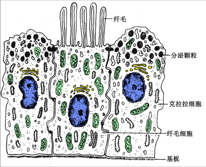克拉拉细胞(Clara cell):柱状,有分泌颗粒,分泌糖蛋白,于管壁形成保护膜。