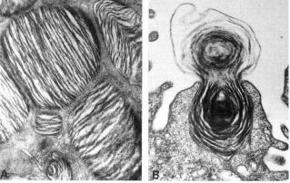 Ⅱ型肺泡细胞和板层小体电镜图: 板层小体: