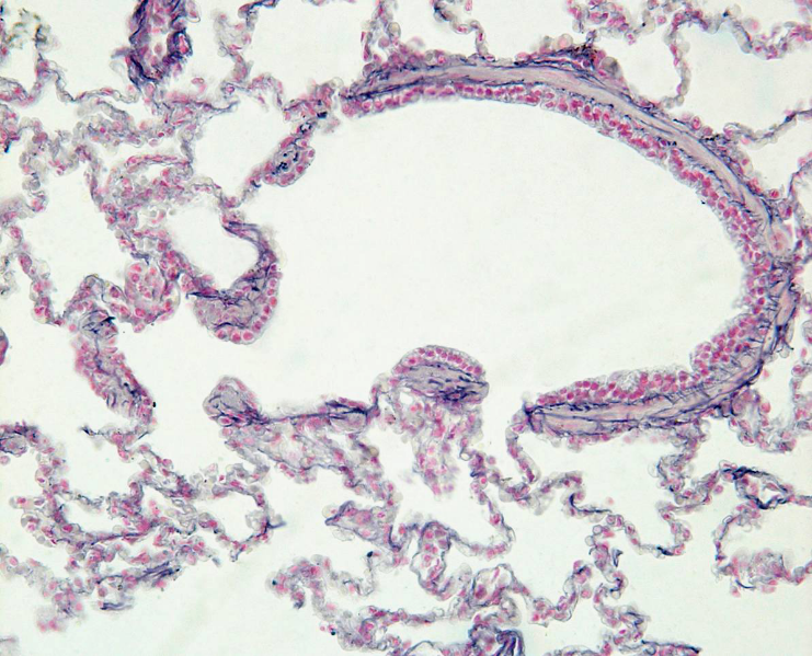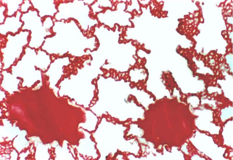 肺内毛细血管光镜图 (卡红明胶注射) 肺内弹性纤维光镜图(龙胆紫与偶氮卡红染色)