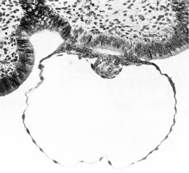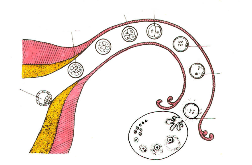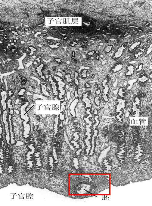 排卵、受精与卵裂过程: 胚泡附着于子宫内膜上皮光镜图: