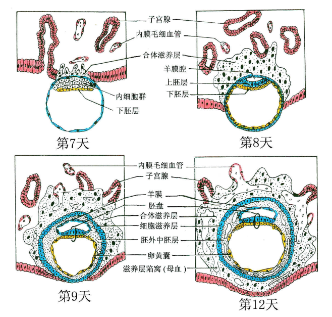 植入过程中,与内膜接触的滋养层迅速增生,形成内、外两层细胞。(合体滋养层、细胞滋养层)