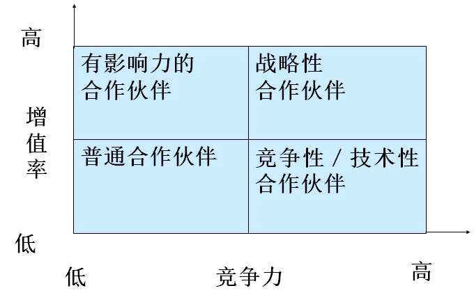根据企业的竞争力和增值率也可以分为以下四种类型供应商: