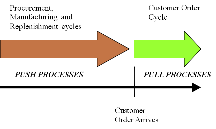 请画出推式和拉式供应链图,并理解供应链如何从推式到拉式的转变的思想内涵。