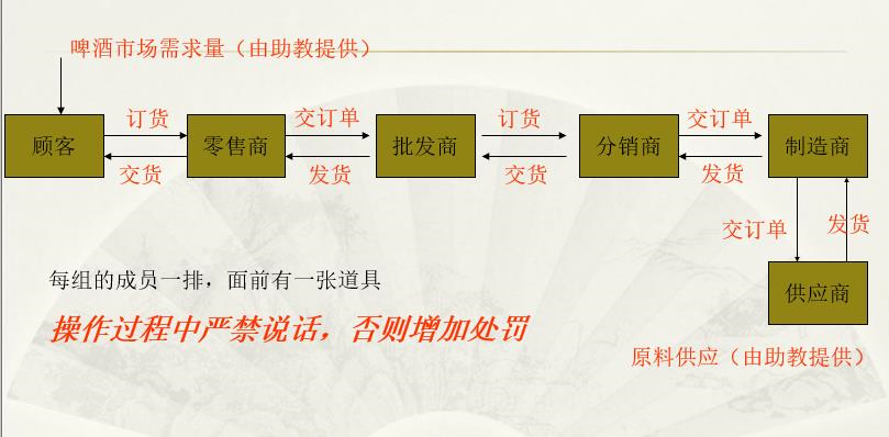 该游戏是生产与配销单一品牌啤酒的产销模拟系统中进行的。参加游戏的学员各自扮演不同的角色:零售商、批发商和制造商。他们只需每周做一个决定,那便是订购多少啤酒,唯一的目标是尽量扮演好自己的角色,使利润最大。三者间的联系知识由卡车司机通过一张纸上的核对数字(订货单、发货单)来沟通信息。