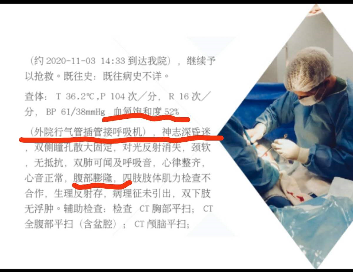 大家注意看红线的文字,外院行气管插管接呼吸机的,血氧饱和度52%,腹部膨隆。如果你接到电话,我们除了要准备好我们的抢救床单元以外,还需要备呼吸机、吸痰机、气管插管用物、胸外心脏按压机等。患者插管上了呼吸机血氧饱和度才52%,腹部还膨隆,要么患者是缺氧时间过长,已经是严重的低氧血症,要么就是气管插管不在气管,在胃内。不能排除,所以我们还必须准备好气管插管的用物(这也是床边必备)。除此,我们还需要人员的准备,药品的准备。若人员不足时,需要及时后备人员到场。团队的操作非常重要。