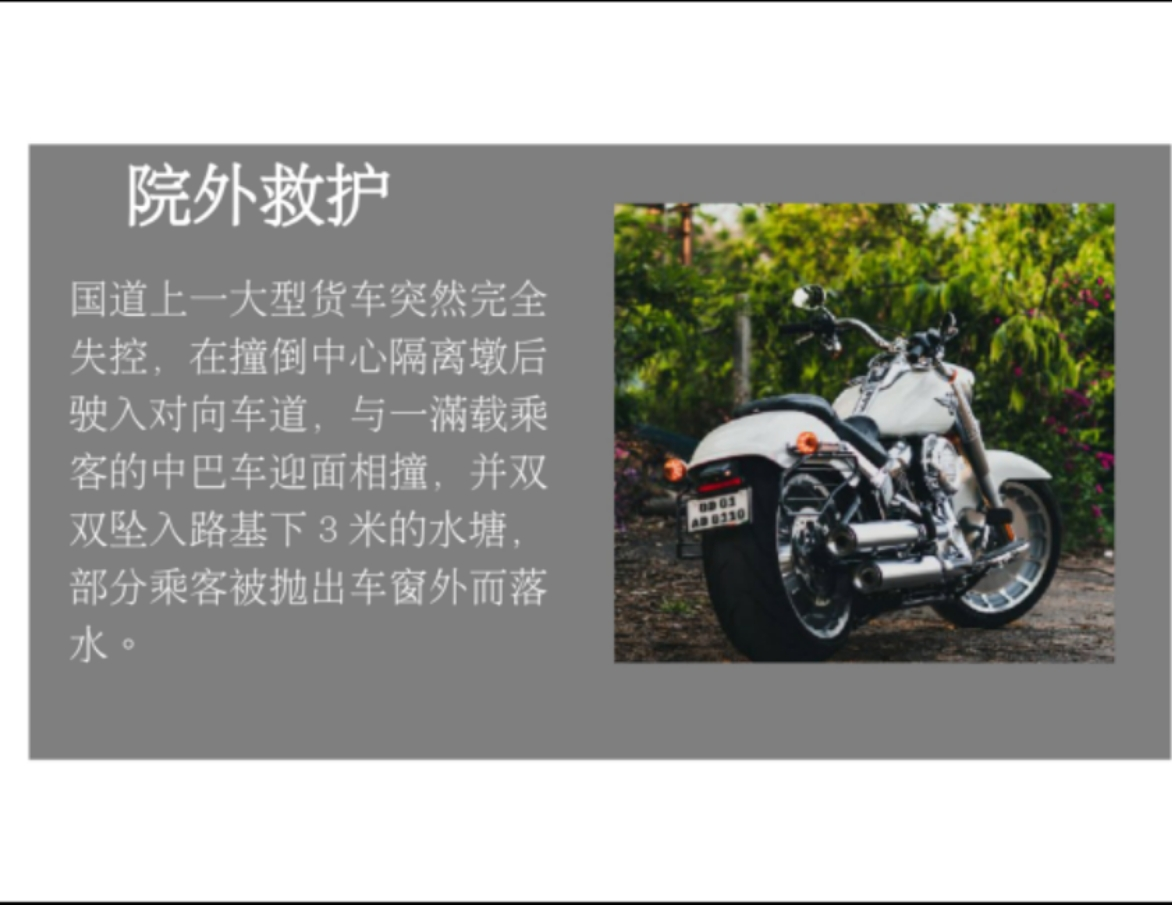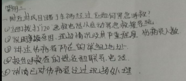 若我们是附近的村民,看到情况后肯定会惊慌失措,这时候一定是要冷静,然后① 立即拨打“120”急救电话以启动紧急救援系统;② 用简洁的语言清晰地告知事故的确切地点,指出周围明显标记和最佳路径;③ 说明事故原因、现场情况及其严重程度、伤病 员人数及存在的危险、现场已经采取的救护措施等。④ 告知现场联系电话和联系人。呼救同时 迅速展开现场急救。当然,这只是模拟的村民的告知,现实中并不一定能做到那么完美。
