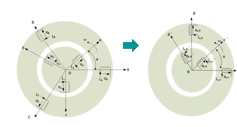 2、7.4.1.2节,转子α’β’坐标系再进行旋转→静止变换,得出定子 αβ 、转子αβ静止坐标系下的数学模型。