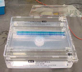 •接通电源,一般红色为正极,黑色为负极,切记DNA样品由负极往正极泳动(靠近加样孔的一端为负),电压为5V/cm(长度以两个电极之间的距离计算)