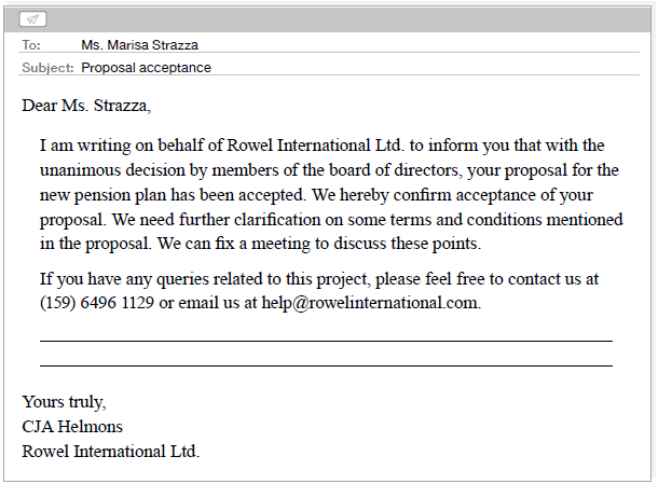 The following is a proposal acceptance email with the appreciation part missing. Work in pairs and write the appreciation part for it.