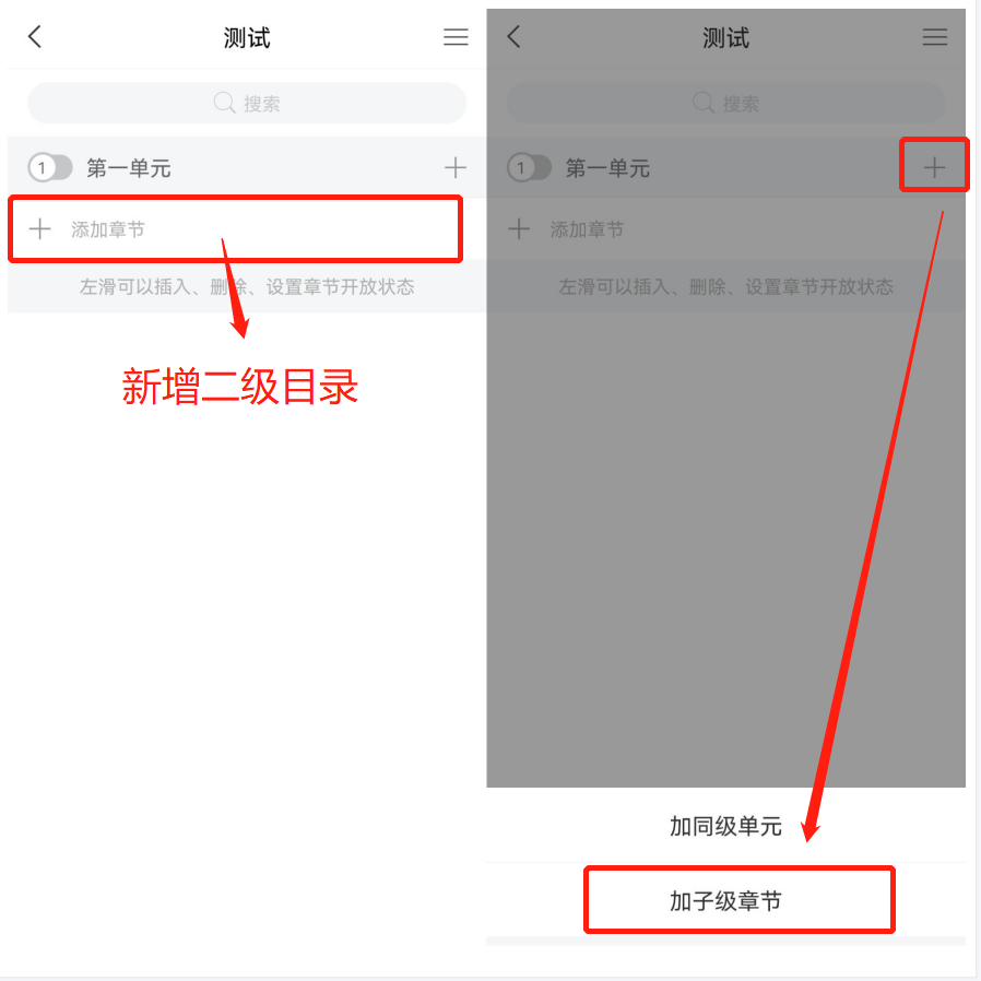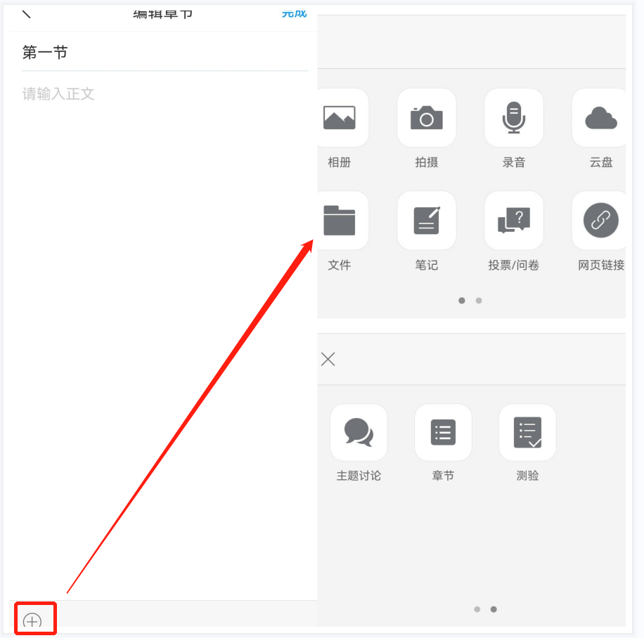 2:①点击一级目录下方的“+”或右边的“+”,新增一个二级目录,命名为:第一小节。在二级目录下可以编辑内容,如文本、图片、音频、录音、测验、笔记、主题讨论等等。