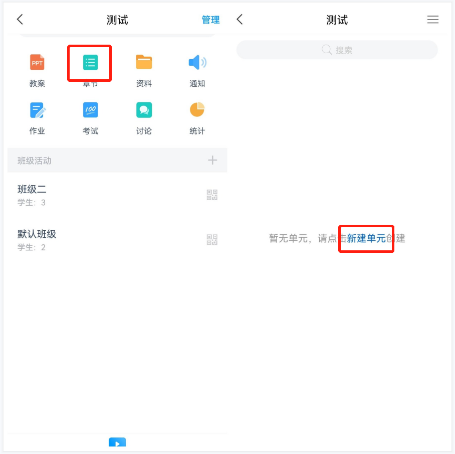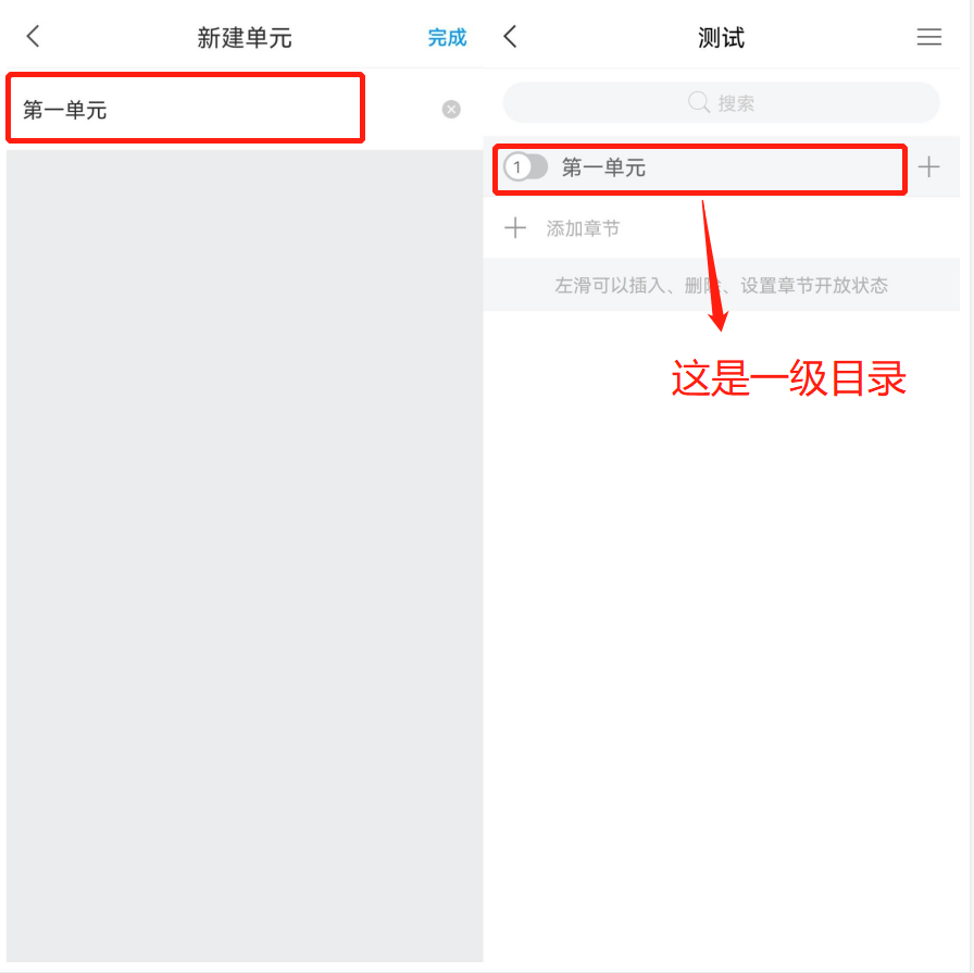 1:在课程页面,点击:【章节】——【新建单元】,新建一个一级目录(注意:一级目录不可编辑内容),可以命名为:第一单元。