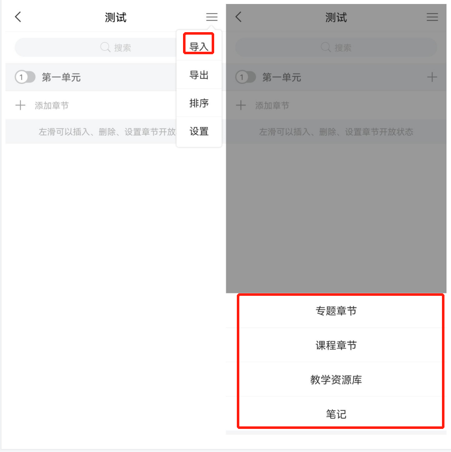 ②或者点击右上角的三横线菜单,直接调用已有的专题章节、课程资源库或者笔记,作为章节内容。