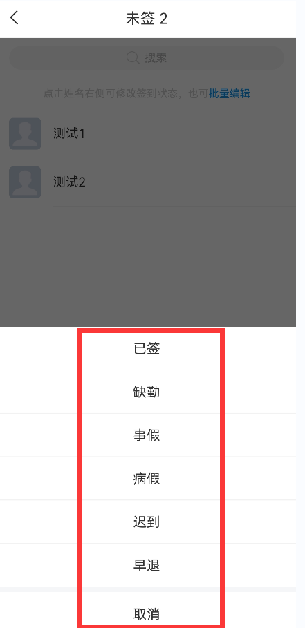2:点击已发放的签到活动,您可以看到截至目前的签到“已签/未签”情况,也可以根据实际情况手动修改签到结果,点击学生可编辑为缺勤、事假、病假等(如图)。