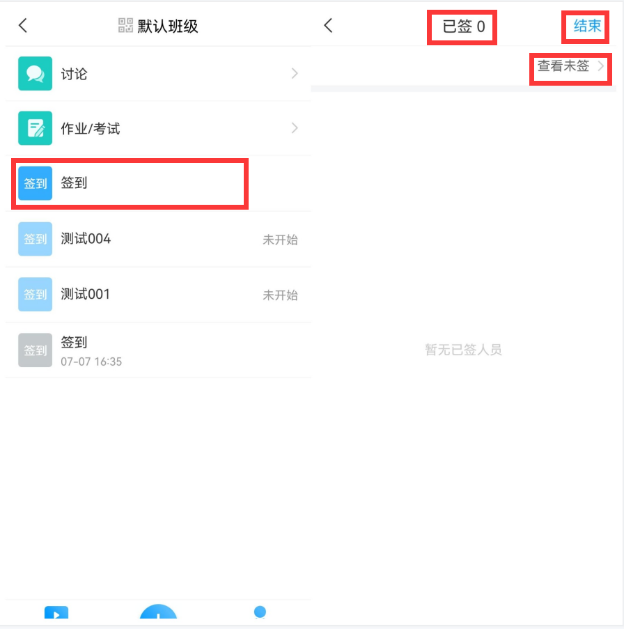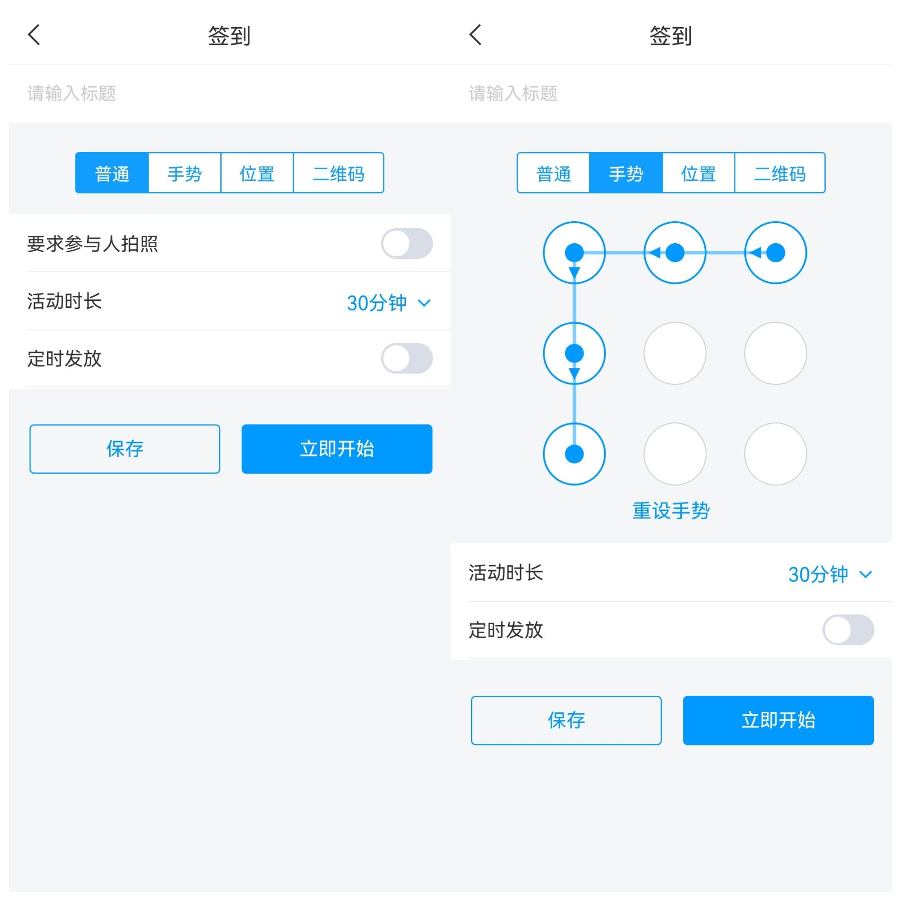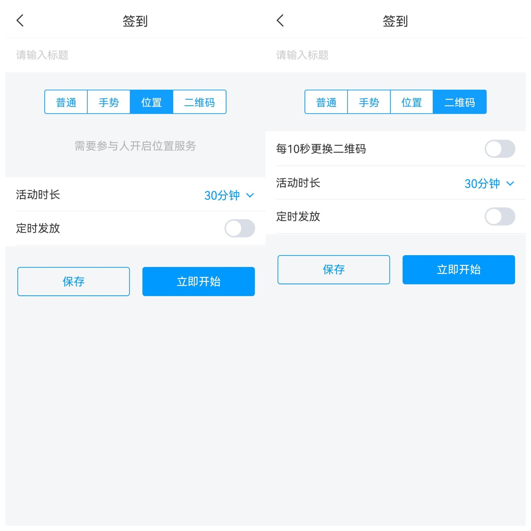 注意:选择一种签到方式后,如果想立即开始,设置好签到后点击下方的【立即开始】,签到便会立即发起。
