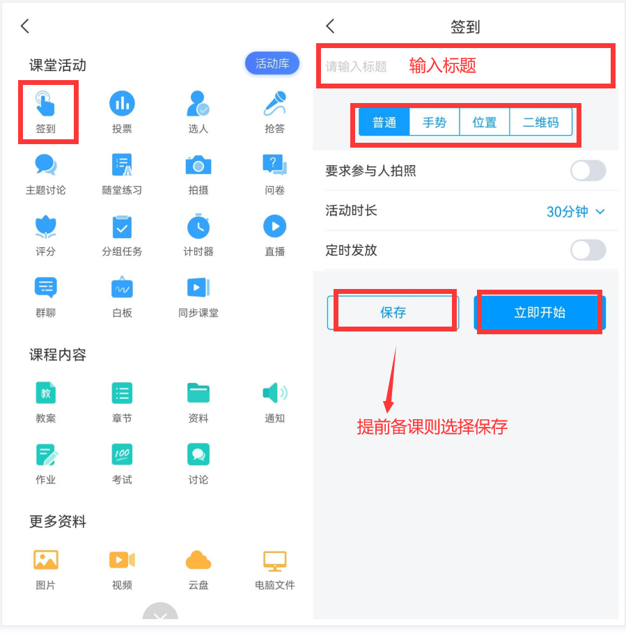 如果不想立即开始活动,设置好签到后只需点击下方的【保存】。签到便会显示在班级活动页面。课上想发起签到只需点击进入,选择【立即开始】即可。