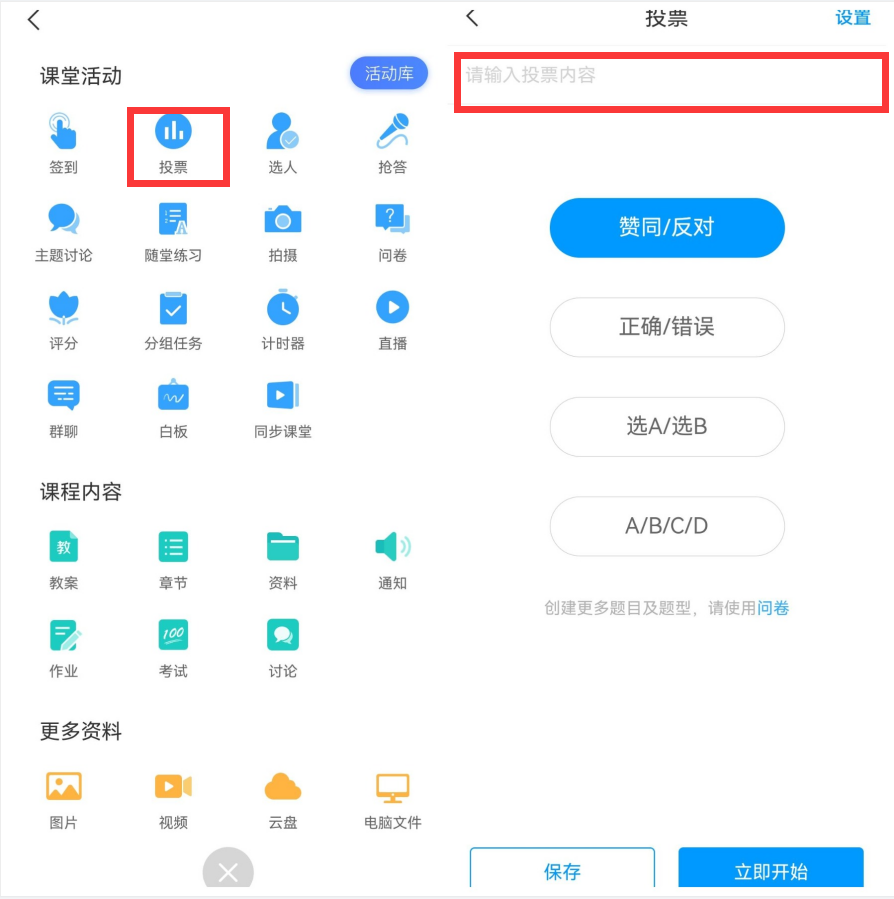 选择任一个要发布课堂活动的班级,点击“+(活动)”按钮,点击活动库里的【投票】,输入投票内容或者教师口述题目或观点,点击【立即开始】或【保存】即可。