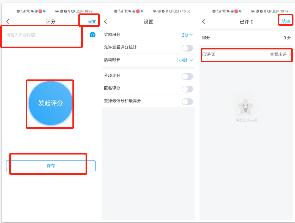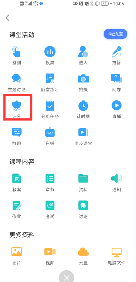 选择任一个要发布课堂活动的班级,点击“+(活动)”按钮,点击活动库里的【评分】,输入评分标题。点击右上角进行评分设置,可设置积分奖励,活动时长,分享评分等。设置完成点击发起评分或者保存。
