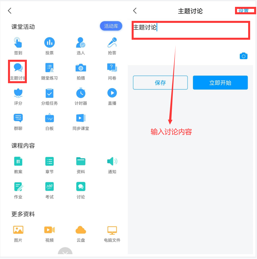 选择任一个要发布课堂活动的班级,点击“+(活动)”按钮,点击活动库里的【主题讨论】,编辑讨论主题,在右上角可设置活动时长和活动结束后是否允许回复。点击【立即开始】或者【保存】即可。发放主题讨论后,可点击“词云”查看出现的高频词汇。
