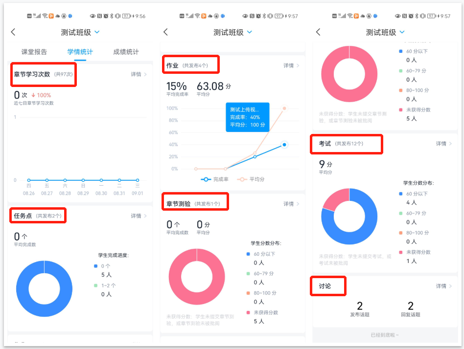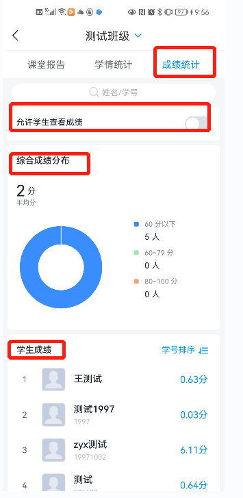 3. 班级统计中包含:课堂报告、学情统计、成绩统计三个模块。