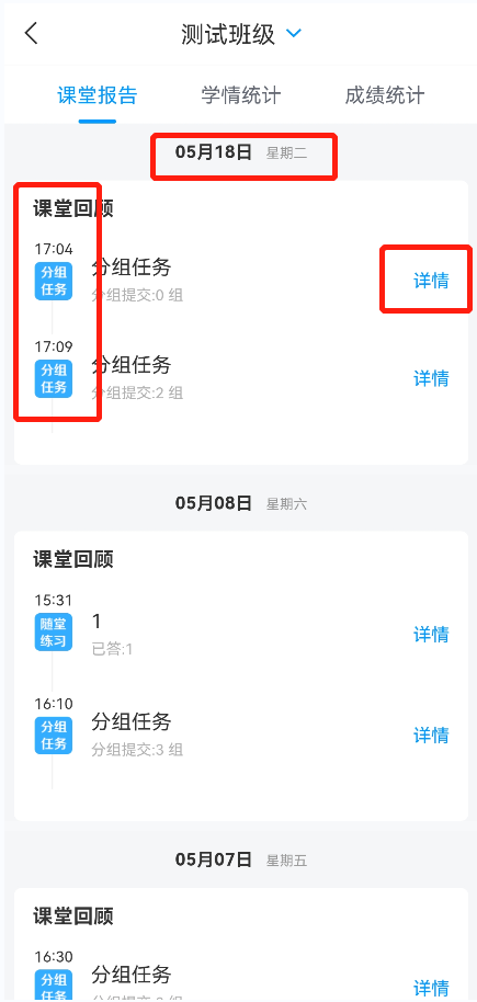 4.(1)课堂报告:可以看到详细的课堂互动的情况,点击右侧详情可详细查看活动详情。